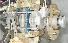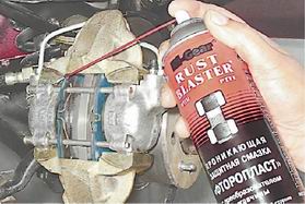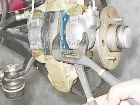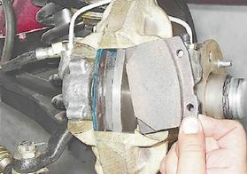 Колодки тормозных механизмов передних колес - заменаВнимание! Колодки заменяем комплектом с обеих сторон автомобиля. Периодически проверяйте состояние накладок тормозных колодок (см. "Тормозная система - проверка технического состояния") и заменяйте их, не допуская износа накладок до толщины менее 1,5 мм. Работа показана на тормозном механизме правого колеса. Снятие 1. Подготавливаем автомобиль к выполнению операций (см. "Подготовка автомобиля к TO и ремонту"). 2. Проверяем уровень тормозной жидкости в бачке. Если уровень находится на метке "МАХ", отбираем грушей часть жидкости из бачка во избежание ее выплескивания при вдавливании поршней в цилиндры. 3. Снимаем переднее колесо (см. "Колесо - замена"). 4. Ветошью очищаем от грязи тормозной механизм и наносим на направляющие пальцы проникающую смазку с преобразователем ржавчины.