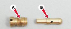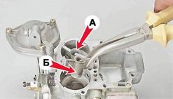 8. Плоскогубцами извлекаем малые диффузоры первичной Б и вторичной А камер. Маркировка диффузора первичной камеры - "22" ("21" для карбюратора 2105-1107010-20), вторичной - "25". Если диффузоры не извлекаются после снятия корпуса дроссельных заслонок (см. ниже) выбиваем их с противоположной стороны выколоткой из мягкого металла.