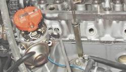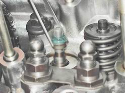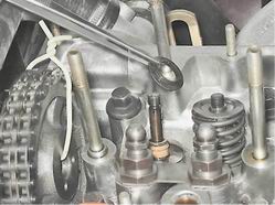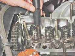 Маслоотражательные колпачки газораспределительного механизма - заменаПризнаком износа маслоотражательных колпачков клапанов является появление дыма голубого цвета из выхлопной трубы особенно при торможении двигателем. Для выполнения работы потребуются рассухариватель, инерционный съемник, динамометрический ключ и оловянный пруток. Снятие 1. Подготавливаем автомобиль к выполнению работы (см. "Подготовка автомобиля к TO и ремонту"). 2. Выворачиваем свечи зажигания (см. "Свечи зажигания - проверка состояния и замена"). Внимание! При выполнении следующей операции (после снятия корпуса распределительного вала) рекомендуется пометить расположение рычагов привода клапанов. 3. Снимаем корпус в сборе с распределительным валом, рычаги приводов клапанов и пружины (см. "Распределительный вал и рычаги клапанов - замена"). При снятии распределительного вала поршни 1-го и 4-го цилиндров были установлены в положение BMT, что позволит исключить падение клапана в цилиндр после снятия сухарей. В этом положении заменяем колпачки у клапанов 1-го и 4-го цилиндров. 4. Устанавливаем через свечное отверстие между поршнем и тарелкой клапана пруток оловянного припоя диаметром около 8 мм.