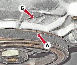 Момент зажигания - проверка и регулировкаПроверять и регулировать момент зажигания рекомендуется с помощью стробоскопа, согласно инструкции по его применению. Для контактной системы зажигания момент можно проверить и отрегулировать с помощью омметра. Для выполнения работы потребуются специальный ключ на 38 мм для поворота коленчатого вала и мультиметр. Последовательность выполнения 1. Подготавливаем автомобиль к выполнению работы (см. "Подготовка автомобиля к TO и ремонту"). Включаем нейтральную передачу. 2. Отсоединяем провод от отрицательного вывода аккумуляторной батареи (см. "Аккумуляторная батарея - снятие и установка"). 3. Снимаем крышку распределителя зажигания (см. "Крышка распределителя и бегунок - проверка и замена"). 4. Специальным ключом на 38 мм проворачиваем коленчатый вал по часовой стрелке (см. "Передний сальник коленчатого вала - замена"), пока боковой контакт бегунка не приблизится (не дойдет около 30°) к контакту крышки распределителя под номером один. 5. Подсоединяем один щуп омметра к "массе", другой к контактному болту распределителя, соединенному с выводом катушки. Сопротивление, показываемое омметром, должно быть равно нулю. 6. Медленно поворачиваем коленчатый вал до совмещения метки на шкиве А с одной из меток Б на крышке привода механизма газораспределения. Если в момент совпадения меток на шкиве и крышке сопротивление возросло до бесконечности - момент зажигания установлен правильно. Если сопротивление возросло раньше или осталось равным нулю, необходимо отрегулировать момент зажигания.