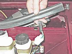 8. Приподняв край уплотнителя, вынимаем жгут проводов стеклоочистителя из прорези в перегородке моторного отсека.