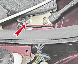Мотор-редуктор очистителя ветрового стекла - снятие и установкаСнятие 1. Подготавливаем автомобиль к выполнению операций (см. "Подготовка автомобиля к TO и ремонту"). 2. Отсоединяем провод от отрицательного вывода аккумуляторной батареи (см. "Аккумуляторная батарея - снятие и установка"). 3. Торцовым ключом на 10 мм отворачиваем накидные гайки крепления рычагов щеток стеклоочистителей.