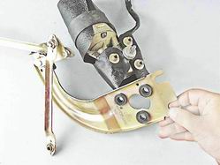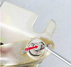 11. Поддев шлицевой отверткой, снимаем пружинный фиксатор и шайбу с оси тяги. Отсоединяем тягу.