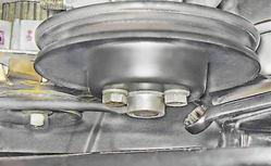 5. Тем же инструментом отворачиваем гайку крепления генератора к регулировочной планке (см. "Генератор - снятие и установка") и снимаем регулировочную планку. 6. Накидным или торцовым ключом на 13 мм ослабляем три болта крепления шкива привода насоса, удерживая шкив от проворачивания большой отверткой.