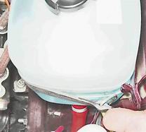 Охлаждающая жидкость - проверка уровня и заменаРасширительный бачок системы охлаждения установлен в моторном отсеке с левой стороны на брызговике и закреплен на кронштейне резиновым хомутом. Рекомендация При снятии и установке шлангов системы охлаждения рекомендуется заменить штатные ленточные хомуты на червячные, имеющие маркировку 25-40. Эти хомуты удобнее при монтаже и надежнее уплотняют соединения. Проверка уровня Уровень жидкости в расширительном бачке должен находиться на 3-4 мм выше метки "MIN". выполненной на полупрозрачном корпусе бачка. 1. Для удобства контроля уровня жидкости отстегиваем резиновый ремень, придерживая бачок рукой.