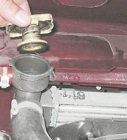 Внимание! Отворачивать пробку расширительного бачка следует только на холодном двигателе, так как на прогретом двигателе внутри бачка создается избыточное давление. 2. При необходимости открываем пробку бачка и доливаем в него охлаждающую жидкость (см. "Эксплуатационные жидкости") до требуемого уровня.
