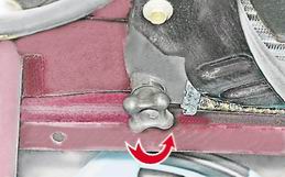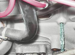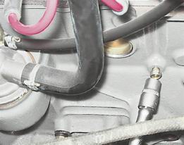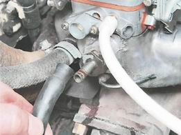 10. Отстегнув ремень крепления расширительного бачка и приподняв его, сливаем жидкость из бачка через радиатор. 11. Устанавливаем бачок на место и закрепляем его ремнем. 12. Заворачиваем пробки сливных отверстий на радиаторе и блоке цилиндров. Примечание Чтобы не возникло воздушных пробок, рекомендуется снять резиновый шланг с патрубка узла подогрева впускного трубопровода. При заполнении системы в момент выхода жидкости из шланга надеваем его на патрубок.