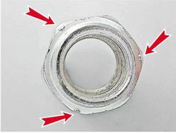 Детали передней подвески: 1 - поворотный кулак (2101-3001014/15); 2 - верхняя шаровая опора (2101-2904192-01); 3 - буфер хода сжатия (2101-2904230); 4 - верхний рычаг (2101-2904100/01); 5 - стабилизатор поперечной устойчивости (2101-2906010); 6 - поперечина передней подвески (2101-2904200); 7 - нижний рычаг (2101-2904020-01/21-01); 8 - амортизатор (2101-2905402-05); 9 - пружина (2101-2902712); 10 - нижняя шаровая опора (2101-2904082); 11 - ступица с подшипниками (2101-3103002); 12 - колпак ступицы (2101-3101065)Передняя подвеска - независимая на двойных поперечных рычагах. Переднее колесо соединено четырьмя болтами со ступицей, установленной на двух роликовых конических подшипниках. Подшипники установлены в ступице и зафиксированы гайкой. Гайка крепления ступицы правого колеса имеет левую резьбу и маркировку в виде трех точек.