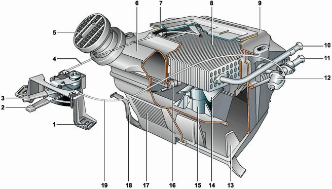 Описание конструкцииСистема вентиляции и отопления служит для создания комфортного микроклимата в салоне автомобиля. Вентиляция и отопление салона обеспечиваются воздухом, забираемым снаружи. Воздух в систему поступает через решетчатые отверстия капота в коробку воздухопритока, расположенную в задней части моторного отсека и изолированную от него резиновым уплотнителем, примыкающим к капоту. В коробке воздухопритока дождевая вода отделяется от воздуха и стекает наружу, а воздух направляется в отопитель. Отверстие отопителя закрывается крышкой воздухопритока. Отопитель расположен в салоне и состоит из кожуха радиатора с крышкой воздухопритока, направляющего кожуха вентилятора и кожуха вентилятора с воздухораспределительной крышкой, соединенных вместе пружинными скобами. Отопитель крепится четырьмя шпильками к усилителю перегородки моторного отсека. Место соединения отопителя с кузовом герметизировано резиновым уплотнителем.