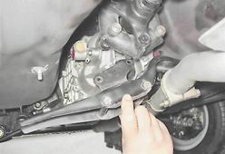 2. Торцовым ключом на 13 мм отворачиваем две гайки крепления опоры к задней крышке коробки передач.