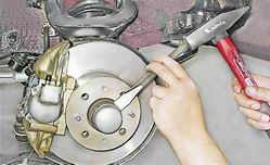 Подшипники ступицы переднего колеса - регулировкаУвеличенные зазоры в подшипниках ступицы переднего колеса приводят к снижению их срока службы, вибрациям при движении и ускоренному износу шин. Чрезмерно затянутые подшипники сильно нагреваются и теряют работоспособность. Последовательность выполнения 1. Подготавливаем автомобиль к выполнению операций (см. "Подготовка автомобиля к TO и ремонту"). 2. Снимаем колесо (см. "Колесо - замена"). 3. С помощью зубила снимаем защитный колпак ступицы.