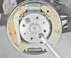 Полуось - снятие и установка, замена сальникаПолуось с подшипником заменяем при ее деформации или сильном износе подшипника, что выражается в заметном осевом люфте вывешенного колеса. Сальник полуоси подлежит замене при обнаружении попадания масла в тормозной механизм заднего колеса, а также в любом случае при замене полуоси. Снятие 1. Устанавливаем автомобиль на смотровую яму или эстакаду (см. "Подготовка автомобиля к TO и ремонту"). 2. Снимаем тормозной барабан (см. "Колодки тормозных механизмов задних колес - замена"). 3. Домкратом дополнительно приподнимаем задний мост со стороны заменяемой полуоси для предотвращения вытекания масла из балки. 4. Проворачиваем полуось до совпадения отверстий большого диаметра в ее фланце с двумя гайками крепления тормозного щита. 5. Торцовым ключом на 17 мм с удлинителем отворачиваем гайки и снимаем пружинные шайбы.