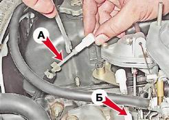 Привод карбюратора - проверка и регулировкаДля выполнения работы потребуется помощник. Последовательность выполнения 1. Подготавливаем автомобиль к выполнению работы (см. "Подготовка автомобиля к TO и ремонту"). 2. Снимаем корпус воздушного фильтра со шпилек карбюратора (см. "Корпус воздушного фильтра - снятие и установка"). 3. При отпущенной педали "газа" дроссельная заслонка первичной камеры должна полностью перекрывать отверстие смесительной камеры. Помощник нажимает на педаль до упора, при этом заслонка должна полностью открыться (принять вертикальное положение). При необходимости регулируем положение заслонки, изменяя длину тяг привода. 4. Прежде всего измеряем расстояние между центрами наконечников поперечной тяги Б (см. рис. п. 5), которое должно составлять 80 мм. При необходимости снимаем тягу и, расконтрив ее наконечники ключом на 8 мм, регулируем тягу по длине. Законтриваем наконечники и устанавливаем тягу на место. 5. Сняв с шарнира промежуточного рычага наконечник продольной тяги привода А и ослабив контргайку, изменяем длину тяги, добиваясь вертикального положения дроссельной заслонки.