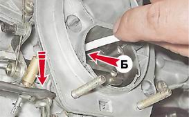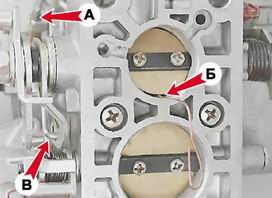 Величина зазора Б должна быть в пределах 0,9-1,0 мм. 10. Зазор регулируем перестановкой в другое отверстие наконечника тяги В приводов воздушной и дроссельной заслонок или подгибанием тяги. 11. Установка всех снятых деталей выполняется в обратной последовательности. |