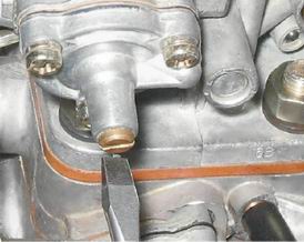Зазор Б между стенкой камеры и кромкой воздушной заслонки должен быть равен 5,25-5,75 мм. 6. Для регулировки зазора открытия воздушной заслонки шлицевой отверткой отворачиваем пробку регулировочного винта.