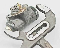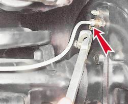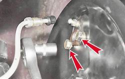 Внимание! Если штуцер "прикипел" к трубке и отвернуть его не удается, попробуйте (после выполнения п. 6) отвернуть цилиндр, удерживая штуцер специальным ключом на 70 мм для тормозных трубок. При таком способе снятия цилиндра тормозную трубку необходимо заменить. 5. Для уменьшения потерь тормозной жидкости надеваем на конец трубки защитный колпачок (от штуцера прокачки тормозного цилиндра). 6. Торцовым ключом на 10 мм отворачиваем два болта крепления рабочего цилиндра и снимаем его.