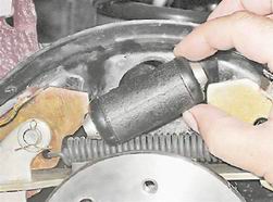 7. Повернув цилиндр относительно отверстия в тормозном щите, выводим упоры цилиндра из зацепления с тормозными колодками.