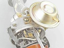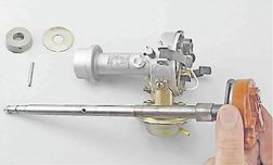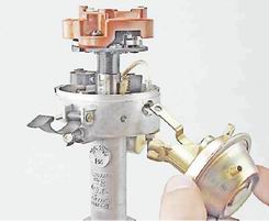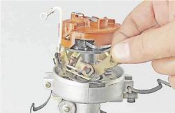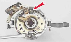 1. Снимаем с корпуса распределителя валик ротора (см. выше) и отсоединяем от подвижной пластины контактную группу (см. выше).