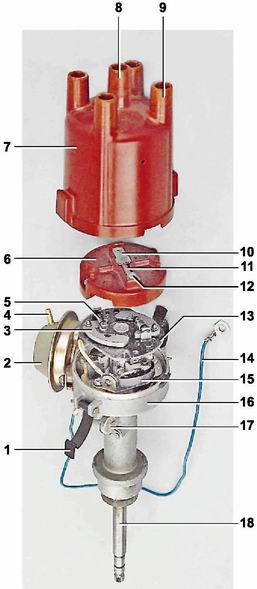 Детали распределителя: 1 - пружинный держатель крышки; 2 - вакуумный регулятор опережения зажигания; 3 - грузик; 4 - штуцер подвода разрежения; 5 - пружина; 6 - ротор (бегунок); 7 - крышка распределителя зажигания; 8 - центральный электрод с клеммой для провода от катушки зажигания; 9 - боковой электрод с клеммой для провода к свече зажигания; 10 - центральный контакт ротора (бегунка); 11 - резистор; 12 - наружный контакт ротора; 13 - опорная пластина регулятора опережения зажигания; 14 - провод, соединяющий распределитель с выводом первичной обмотки катушки зажигания; 15 - контактная группа прерывателя; 16 - корпус распределителя; 17 - конденсатор; 18 - валик распределителяРаспределитель состоит из алюминиевого корпуса, валика, контактного прерывателя, центробежного и вакуумного регуляторов опережения зажигания, ротора (бегунка) и закрепленной сверху на корпусе двумя пружинными держателями пластмассовой крышки. Распределитель зажигания установлен в отверстии блока цилиндров левой передней части двигателя. Валик распределителя приводится во вращение от шестерни привода вспомогательных агрегатов, в шлицевое отверстие которой вставлен хвостовик валика. Валик вращается в пористой металлокерамической втулке, запрессованной в верхней части корпуса распределителя. Смазка ко втулке подводится от масленки на боковине корпуса. На верхней части валика закреплен пластмассовый ротор (бегунок) распределителя. Бегунок имеет центральный и наружный контакты, соединенные через резистор, предназначенный для подавления радиопомех. Бегунок крепится двумя винтами на опорной пластине центробежного регулятора опережения зажигания в определенном положении. В центральный контакт бегунка упирается подпружиненный угольный электрод крышки распределителя, вывод которого соединен с высоковольтным выводом катушки. При вращении бегунка импульсы высокого напряжения передаются от наружного контакта бегунка к боковым электродам крышки распределителя зажигания и далее по высоковольтным проводам к свечам. Прерыватель состоит из контактной группы и кулачка с четырьмя выступами. Контактная группа закреплена двумя винтами на подвижной пластине. Для регулировки положения контактной группы на пластине одно из крепежных отверстий группы выполнено продолговатым. Пластина поворачивается на шариковом подшипнике, установленном в корпусе распределителя. Кулачок прерывателя выполнен как часть валика. Поверхность кулачка смазывается специальным фитилем - фильцем, установленным на подвижной пластине. Один контакт контактной группы находится на подвижном подпружиненном рычажке, другой контакт группы неподвижный. При вращении валика кулачок, нажимая выступом на пластмассовую колодку рычажка подвижного контакта, размыкает цепь, подающую напряжение на первичную обмотку катушки зажигания. Для того чтобы не возникало искрений на разомкнутых контактах прерывателя, вызванных изменением магнитного потока в первичной обмотке катушки, в цепь прерывателя параллельно подключен конденсатор, закрепленный винтом на корпусе распределителя. Начальная установка опережения зажигания выставляется на холостом ходу двигателя и регулируется вручную поворотом корпуса распределителя (см. "Момент зажигания - проверка и регулировка"). При повороте корпуса по часовой стрелке опер
