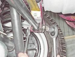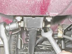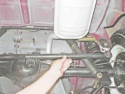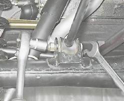 5. Сняв пружинную шайбу и вынув болт, снимаем с автомобиля нижнюю продольную реактивную штангу. Установка Установка нижней штанги и амортизатора выполняется в обратной последовательности. Самоконтрящиеся гайки рекомендуется заменить новыми. Внимание! Левая и правая штанги - не взаимозаменяемые. При установке ориентируйте штангу так, чтобы держатель троса привода стояночного тормоза был направлен вверх и располагался ближе к заднему мосту. При этом трос должен проходить с внутренней стороны держателя. Снятие поперечной штанги 1. Ключом на 19 мм отворачиваем гайку болта крепления штанги к кронштейну заднего моста, удерживая болт от проворачивания ключом того же размера.