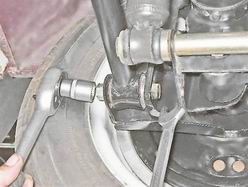 2. Снимаем пружинную шайбу и вынимаем болт, при необходимости пользуясь выколоткой из мягкого металла, чтобы не повредить резьбу. 3. Торцовым ключом на 19 мм отворачиваем самоконтрящуюся гайку болта крепления штанги к лонжерону кузова.