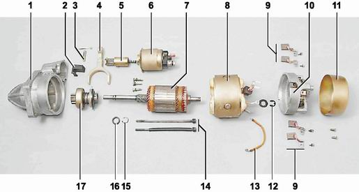 Детали стартера 35.3708: 1 - передняя крышка; 2 - уплотнитель; 3 - ось рычага привода; 4 - рычаг привода; 5 - шток; 6 - тяговое реле стартера; 7 - якорь; 8 - корпус со статором; 9 - щетки; 10 - задняя крышка стартера; 11 - кожух; 12 - стопорная шайба; 13 - перемычка; 14 - стяжные болты; 15 - стопорное кольцо; 16 - ограничительное кольцо хода шестерни; 17 - обгонная муфта с шестерней приводаВнутри корпуса закреплены винтами четыре полюса с установленными на них обмотками возбуждения. Вал якоря вращается в двух бронзографитовых втулках, запрессованных в крышках стартера. Якорь состоит из вала, сердечника с обмоткой и коллектора. На переднем конце вала подвижно установлена шестерня привода, жестко соединенная со ступицей роликовой обгонной муфты. Перемещение шестерни на валу ограничивается кольцом. На внутренней поверхности ступицы выполнены винтовые шлицы, входящие в зацепление с винтовыми шлицами вала. На ступице установлено поводковое кольцо, ушки которого входят в пазы рычага привода. Другим концом рычаг опирается на шток электромагнитного тягового реле, закрепленного на передней крышке тремя винтами. В задней крышке установлен щеткодержатель с двумя изолированными от корпуса (положительными) и двумя замкнутыми на корпус (отрицательными) щетками. Тяговое реле стартера служит для ввода шестерни привода стартера в зацепление с венцом маховика и для замыкания цепи питания обмоток якоря и статора. В крышке реле установлены контактные болты. Один болт соединен проводом с плюсовым выводом аккумуляторной батареи, а другой - с обмотками статора и реле. При повороте ключа зажигания в положение II ("стартер"), напряжение подается на вывод "50" крышки тягового реле. При этом возникающее магнитное поле втягивает якорь. Контактная пластина замыкает контактные болты, а шток воздействует на рычаг привода. Рычаг, перемещая шестерню привода, вводит ее в зацепление с зубчатым венцом маховика двигателя. Через замкнутые контакты реле протекает ток питания статора и якоря. В результате взаимодействия магнитных полей начинает вращаться якорь стартера вместе со ступицей и наружным кольцом обгонной муфты. При этом ролики обгонной муфты заклиниваются между наружным и внутреннем кольцом муфты. Крутящий момент от вала якоря передается через муфту и шестерню привода к венцу маховика. После запуска двигателя частота вращения шестерни начинает превышать частоту вращения вала якоря стартера. Ролики муфты расклиниваются, при этом крутящий момент от маховика не передается на вал якоря стартера. При возвращении ключа в положение I ("зажигание") цепь питания обмоток тягового реле размыкается и под действием возвратной пружины реле якорь возвращается в исходное положение, размыкая контактные болты и выводя шестерню привода из зацепления. |