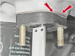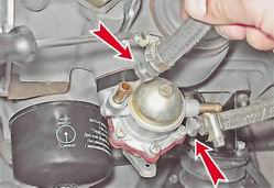 Топливный насос - снятие и установкаСнятие 1. Подготавливаем автомобиль к выполнению работы (см. "Подготовка автомобиля к TO и ремонту"). 2. Ветошью очищаем от грязи и промываем уайт-спиритом или очистителем двигателя наружную поверхность топливного насоса (если не планируется его замена) и блок цилиндров рядом с местом крепления насоса. Внимание! При выполнении следующей операции из шлангов будет вытекать топливо. Приготовьте два болта М8 для заглушки отверстий шлангов. 3. Крестовой отверткой или ключом на 8 мм ослабляем хомуты крепления топливных шлангов и снимаем шланги со штуцеров топливного насоса. Заглушаем концы шлангов болтами M8.
