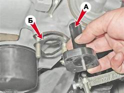 6. Снимаем и очищаем от грязи теплоизолирующую проставку А. При необходимости заменяем прокладку Б между теплоизолирующей проставкой и блоком цилиндров. Толщина прокладки - 0,8 мм.