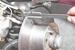 Тормозная система - проверка технического состоянияСостояние тормозной системы проверяем согласно периодичности технического обслуживания (см. "Периодическое техническое обслуживание"). Для выполнения работы потребуется штангенциркуль. Последовательность выполнения 1. Устанавливаем автомобиль на смотровую яму или эстакаду (см. "Подготовка автомобиля к TO и ремонту"). 2. Для проверки состояния гидропривода тормозов потребуется помощник, который должен энергично нажать на педаль тормоза 3-4 раза и удерживать ее во время проверки нажатой, тем самым создавая давление в системе. При обнаружении негерметичности соединений подтягиваем их крепежные элементы. На поверхности тормозных шлангов не должны образовываться вздутия, если они есть, заменяем шланг. Шланги, независимо от их состояния, рекомендуется заменять после пяти лет эксплуатации автомобиля, т. к. шланг, вследствие старения резины, может при торможении лопнуть. Тормозные трубки не должны иметь вмятин или трещин. В противном случае их необходимо заменить (см. "Тормозные трубки - замена"). 3. Проверяем состояние тормозных механизмов передних колес. Для этого снимаем колесо (см. "Колесо - замена") и визуально оцениваем и при необходимости измеряем толщину фрикционных накладок тормозных колодок. При толщине накладки менее 1,5 мм заменяем колодки тормозных механизмов правого и левого колес (см. "Колодки тормозных механизмов передних колес - замена"). Снимаем суппорт тормозного механизма и оцениваем состояние тормозного диска. Если на рабочей поверхности диска образовались глубокие борозды или трещины, его необходимо заменить (см. "Тормозной механизм переднего колеса - разборка"). Так как тормозные колодки прилегают к диску не по всей его поверхности, то у внешней кромки диска образуется буртик. При измерении толщины тормозного диска это необходимо учитывать. Штангенциркулем или микрометром измеряем толщину тормозного диска.