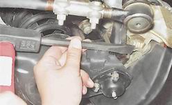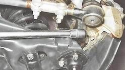 3. Для того чтобы суппорт не висел на тормозном шланге, подвязываем его к верхнему рычагу подвески, закрепив проволокой или веревкой. 4. Торцовым ключом с глубокой головкой на 7 мм (12 мм на автомобилях ранних выпусков) отворачиваем два направляющих штифта.