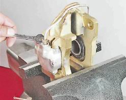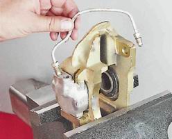 Рабочий цилиндр необходимо заменить при заклинивании поршня или при утечке тормозной жидкости через уплотнительное кольцо. 9. Закрепляем суппорт в тисках. 10. Ключом на 10 мм отворачиваем два штуцера крепления соединительной трубки рабочих цилиндров.