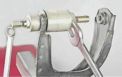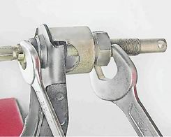 6. Для снятия резинометаллических шарниров закрепляем рычаг в тисках. С помощью специального съемника выпрессовываем из рычага резинометаллические шарниры.