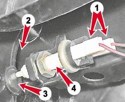 3. Ключом на 19 мм ослабляем контргайку 2 и, вращая выключатель 4, добиваемся его касания упора педали 3. 4. Затягиваем контргайку и в произвольном порядке подсоединяем колодки проводов. Если неполное растормаживание тормозных механизмов не удалось устранить регулировкой положения выключателя сигналов торможения, то необходимо проверить величину выступания головки штока относительно плоскости на корпусе вакуумного усилителя тормозов (см. "Вакуумный усилитель тормозов - замена"). |