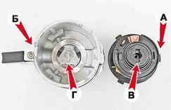 Сборка 1. Устанавливаем контактную группу замка, совмещая широкий выступ А на контактной группе с широким пазом Б на корпусе замка и при этом совмещаем паз В в торце оси контактной группы с торцовым выступом Г оси замка.