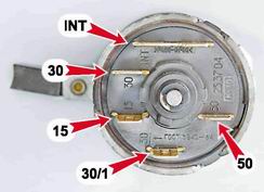 2. Устанавливаем выключатель в кронштейн и подсоединяем провода. К выводу 15 подсоединен голубой с черной полосой провод, к 30/1 - коричневый, к 30 - розовый, к INT - черный, к 50 - красный.