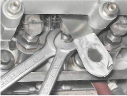 9. Вынимаем щуп. Удерживая ключом регулировочный болт, вторым ключом затягиваем контргайку. Обычно регулировочный болт при этом немного поднимается, уменьшая выставляемый зазор. При необходимости регулировку повторяем. 10. Поворачиваем коленчатый вал на 360°. При этом распределительный вал и бегунок распределителя зажигания повернется на 180°. 11. Аналогично регулируем зазоры у впускного клапана 2-го цилиндра (3-й кулачок) и выпускного клапана 3-го цилиндра (5-й кулачок), а также впускного (2-й кулачок) и выпускного (1-й кулачок) клапанов 1-го цилиндра. 12. Установка всех снятых деталей выполняется в обратной последовательности. |