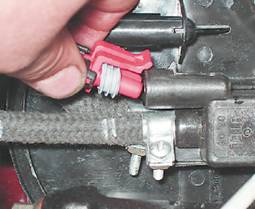 Напряжение на выводе должно быть не меньше 12 В. Если напряжение не поступает на колодку или оно меньше 12 В, - разряжена аккумуляторная батарея, неисправна цепь питания или неисправен ЭБУ. 5. Для проверки самого клапана крестовой отверткой ослабляем затяжку хомута крепления шланга к клапану продувки адсорбера и снимаем шланг.