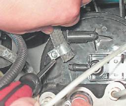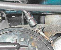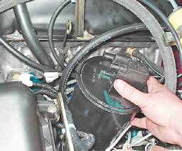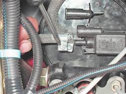 7. Подаем на выводы клапана напряжение 12 В от аккумуляторной батареи ("+" к выводу "А", "-" к выводу "В"). При подаче напряжения на выводы, клапан должен открыться с характерным щелчком. В противном случае клапан неисправен и его необходимо заменить. Снятие адсорбера 1. Отсоединяем от клапана продувки адсорбера колодку жгута проводов и снимаем с патрубка шланг (см. выше). 2. Крестовой отверткой ослабляем затяжку хомута крепления шланга подвода паров топлива к адсорберу и снимаем шланг.