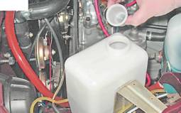 Бачок омывателя ветрового стекла на автомобиле с карбюраторным двигателем находится в моторном отсеке с левой стороны (на автомобиле с впрысковым двигателем - с правой стороны) и закреплен на кронштейне брызговика.