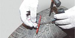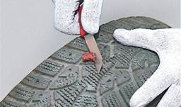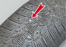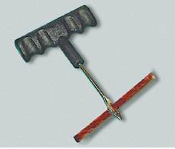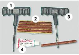 1 - приспособление с резьбовым наконечником или с насечками; 2 - полоски сырой резины; 3 - игла с разъемным ушком; 4 - клей-активатор для сырой резины Предупреждение! Шину с проколом большого размера, повреждением корда или с порезом боковины необходимо заменить. Ремонт шины возможен без снятия колеса, достаточно поддомкратить автомобиль и установить на опору. Эксплуатация автомобиля допускается сразу после ремонта. Предупреждение! При движении на отремонтированной шине следует соблюдать осторожность: снизить скорость движения, чтобы при внезапном разрушении шины иметь возможность принять адекватные меры; стараться объезжать неровности дороги, или проезжать их на малой скорости. При первой возможности отремонтированную шину необходимо заменить. Допустимо использовать такую шину на запасном колесе. Последовательность выполнения 1. Находим место прокола (по выходящему из прокола воздуху или по предмету, пробившему шину).