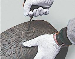 Бескамерная шина - ремонтВнимание! При необходимости (прокол, утечка воздуха из-за деформации обода колеса) бескамерная шина может быть установлена в сборе с камерой. Быстрый ремонт бескамерной шины можно произвести с помощью специального ремонтного набора, обеспечивающего надежную герметизацию поврежденного участка. Однако, следует учитывать, что такой ремонт пригоден только для устранения мелких проколов. В большинстве случаев это временная мера, чтобы иметь возможность добраться до места ремонта или стоянки. Наборы для ремонта шин могут различаться комплектуемым материалом. Поэтому при выполнении работы необходимо следовать инструкции, прилагаемой к набору.