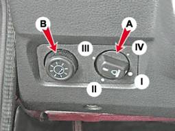 Для регулировки, совмещая метку, нанесенную на регуляторе с меткой на корпусе блока, добиваемся такого направления света, при котором не будет происходить ослепление водителей встречных транспортных средств (при включенном ближнем свете фар). Положения регулятора гидрокорректора фар при следующих вариантах загрузки: I - один водитель или водитель с пассажиром на переднем сиденье; II - водитель с четырьмя пассажирами; III - водитель с четырьмя пассажирами и грузом в багажнике массой не более 75 кг; IV - один водитель и груз в багажнике массой не более 100 кг. Регулятор освещения приборов В служит для изменения яркости подсветки приборов. При включенном наружном освещении, при вращении регулятора по часовой стрелке увеличивается яркость подсветки, в обратную сторону - уменьшается. |