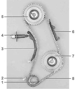 Детали привода газораспределительного механизма: 1 - звездочка коленчатого вала (2101-1005030); 2 - ограничительный палец цепи (2101-1006050); 3 - башмак натяжителя (2103-1006090-02); 4 - натяжитель цепи (21213-1006060); 5 - звездочка распределительного вала (2101-1006020); 6 - успокоитель цепи (2101-1006100); 7 - звездочка привода валика вспомогательных агрегатов (2101-1006020); 8 - цепь (2103-1006040)Снятие 1. Подготавливаем автомобиль к выполнению операций (см. "Подготовка автомобиля к ТО и ремонту"). 2. Снимаем ремень генератора (см. "Ремень привода генератора - регулировка натяжения и замена"). 3. Снимаем крышку головки блока цилиндров (см. "Прокладка крышки головки блока цилиндров - замена"). 4. Совмещаем метку на звездочке распределительного вала с выступом на корпусе подшипников (см. "Зазор между рычагами клапанов и кулачками распределительного вала - регулировка"). 5. Снимаем шкив коленчатого вала (см. "Передний сальник коленчатого вала - замена"). 6. При помощи зубила отгибаем лепесток стопорной шайбы болта крепления звездочки распределительного вала и отворачиваем болт (см. "Распределительный вал и рычаги клапанов - замена"). 7. Торцовым ключом на 10 мм с удлинителем отворачиваем три болта крепления картера к крышке привода распределительного вала и ослабляем два соседних с ними болта.