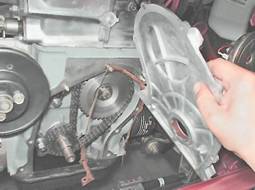 15. Торцовым ключом на 17 мм отворачиваем болт крепления звездочки. Снимаем звездочку и цепь привода газораспределительного механизма.