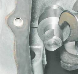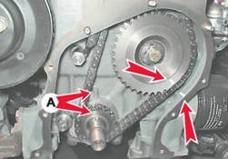 Примечание На звездочке коленчатого вала и блоке цилиндров выполнены метки А, при совмещении которых поршни 1-го и 4-го цилиндров находятся в верхней мертвой точке (ВМТ). 12. Снимаем звездочку и цепь с распределительного вала (см. "Распределительный вал и рычаги клапанов - замена"). 13. Снимаем натяжитель цепи привода газораспределительного механизма (см. "Натяжитель цепи привода газораспределительного механизма - замена"). 14. При помощи зубила отгибаем лепесток стопорной шайбы болта крепления звездочки привода валика вспомогательных агрегатов.