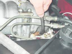 5. Отсоединяем от регулятора давления вакуумный шланг и визуально оцениваем изменение давления. При исправном регуляторе давление должно увеличиться на 0,2-0,7 бар (20-70 кПа). В противном случае регулятор давления топлива подлежит замене (см. ниже "Регулятор давления - снятие и установка").