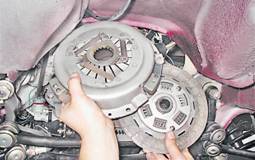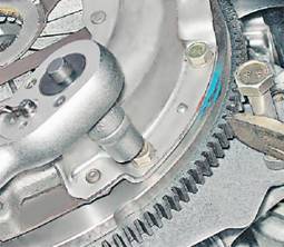 Детали сцепления - снятие и установкаДля работы потребуется центрирующая оправка. Снятие 1. Устанавливаем автомобиль на смотровую яму или эстакаду (см. "Подготовка автомобиля к ТО и ремонту"). 2. Снимаем коробку передач (см. "Коробка передач - снятие и установка"). 3. Вворачиваем в отверстие блока цилиндров один из болтов крепления картера сцепления. Совет Если замена корзины не планируется, то кернером помечаем ее положение на маховике. Внимание! При выполнении следующей операции, во избежание деформации кожуха сцепления, болты отворачиваем последовательно, не более чем на один оборот за проход. 4. Удерживая маховик от проворачивания монтажной лопаткой, вставленной между зубьев венца маховика, торцовым ключом на 13 мм отворачиваем шесть болтов крепления корзины к маховику.