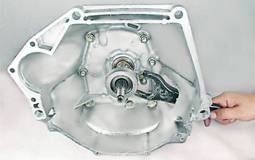 7. Выводим вилку из зацепления с пружиной муфты выжимного подшипника, снимаем вилку с шаровой опоры и извлекаем ее из отверстия в картере сцепления.