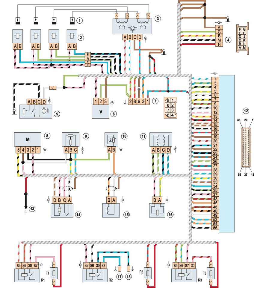 Электрическая схема системы управления двигателем с контроллером M 1.5.4N: 1 - свечи зажигания; 2 - форсунки; 3 - модуль зажигания; 4 - колодка диагностического разъема; 5 - электробензонасос с датчиком уровня топлива; 6 - датчик скорости автомобиля; 7 - колодка соединения со жгутом проводов панели приборов; 8 - датчик массового расхода воздуха; 9 - датчик управления дроссельной заслонкой; 10 - датчик температуры охлаждающей жидкости; 11 - регулятор холостого хода; 12 - электронный блок управления (ЭБУ); 13 - к положительному выводу аккумуляторной батареи; 14 - датчик концентрации кислорода; 15 - датчик положения коленчатого вала; 16 - электромагнитный клапан продувки адсорбера; 17 - колодка провода к монтажному блоку (вывод 6 колодки Ш6); 18 - колодка провода к выводу "+" электровентилятора; R1 - главное реле; R2 - реле электровентилятора; R3 - реле электробензонасоса; F1 - предохранитель цепи главного реле (15А); F2 - предохранитель ЭБУ (15А); F3 - предохранитель цепи электробензонасоса (15A) |