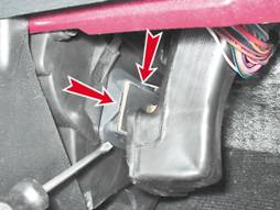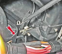 Электродвигатель вентилятора отопителя - заменаСнятие 1. Подготавливаем автомобиль к выполнению операций (см. "Подготовка автомобиля к ТО и ремонту"). 2. Устанавливаем нижний рычаг блока управления системой вентиляции в крайнее правое положение, закрывая воздушные заслонки боковых воздуховодов. 3. Снимаем щиток приборов (см. "Щиток приборов - снятие и замена ламп"). 4. Снимаем вещевую полку и корпус вещевого ящика (см. "Панель приборов - снятие и установка"). 5. Снимаем панель радиоприемника (см. "Панель радиоприемника - снятие и установка"). 6. Отсоединяем от колодки проводов переключателя режимов работы вентилятора отопителя провода сине-черного и красного цвета. 7. В пространстве за щитком приборов ключом на 7 мм ослабляем болт крепления оболочки гибкой тяги управления заслонкой и отсоединяем тягу.